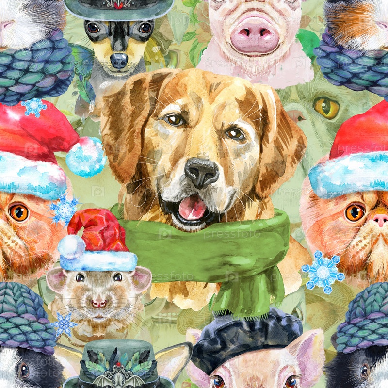 Бесшовный рисунок домашних животных. Ручная роспись акварелью, изолировать клип-арт на белом фоне
