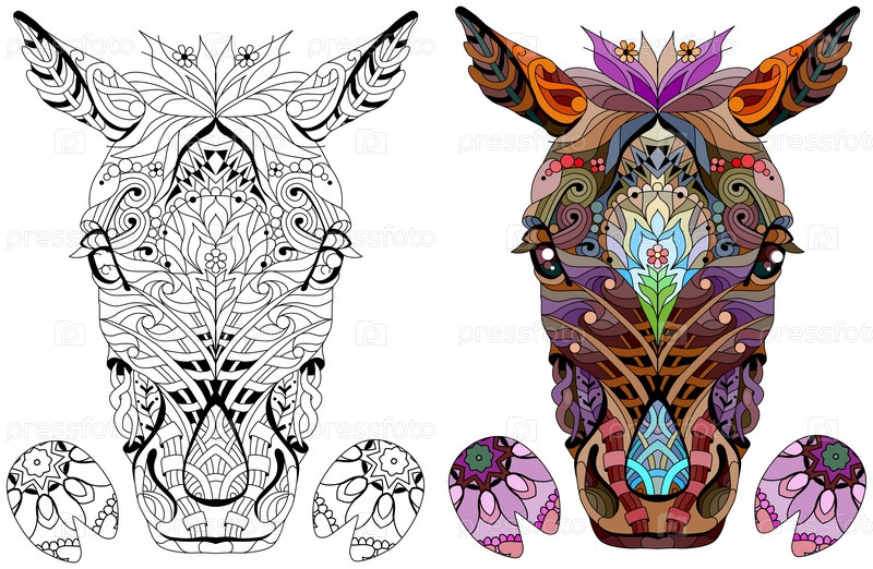Голова лошади в стиле зентангл с копытами для дизайна футболки, раскраски, татуировки и других украшений. Черно-белые и цветные изображения