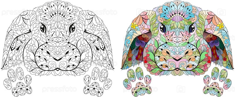 Голова кролика с лапками в технике дзентангл для раскрашивания. Ручная рисованная декоративная векторная иллюстрация для раскраски. Черно-белые и цветные изображения