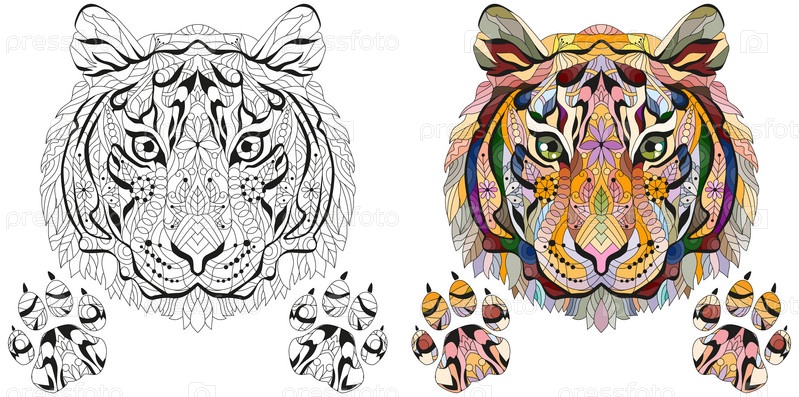 Запутайте голову тигра с лапами. Ручная рисованная декоративная векторная иллюстрация. Черно-белые и цветные изображения