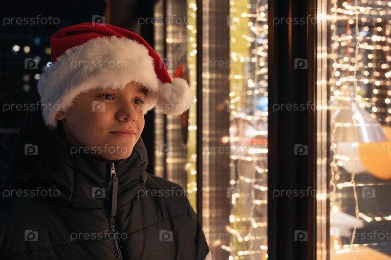 Мальчик в шляпе Санты смотрит и мечтает в освещенной витрине. Рождество представляет праздники или покупки на Новый год или Рождество