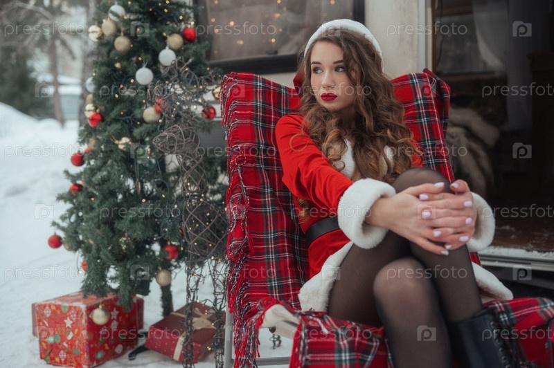 Молодая женщина в костюме Санты отдыхает в зимнем лагере. Концепция празднования Нового года