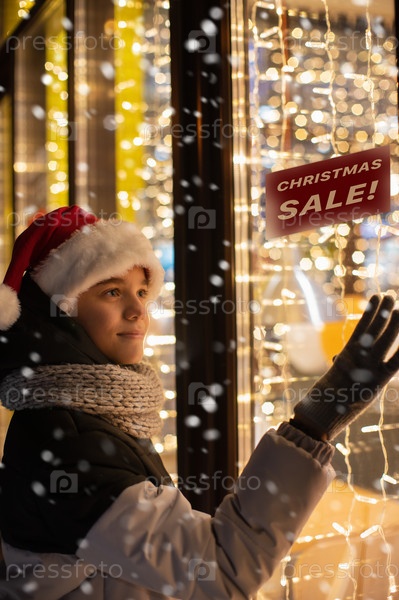 Мальчик в шляпе Санты смотрит в витрину магазина