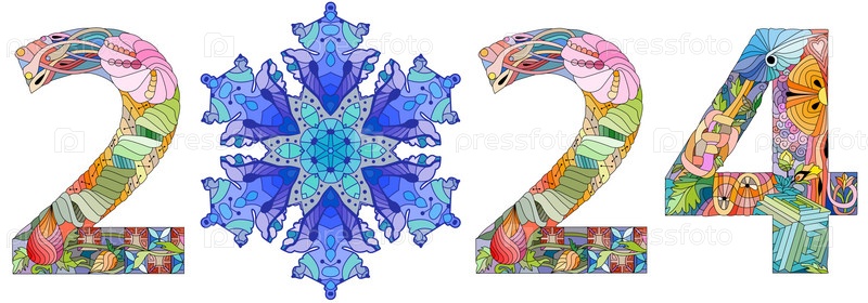 Текст логотипа 2024 года со снежинкой. Шаблон дизайна Праздничный типографский плакат, баннер или поздравительная открытка с Новым годом