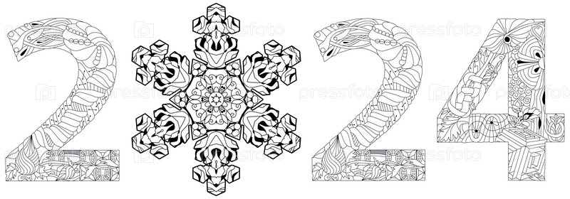 Текстовый дизайн логотипа 2024 года со снежинкой для раскраски. Шаблон оформления Праздничный типографский плакат, баннер или поздравительная открытка с Новым годом