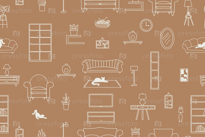 Бесшовный рисунок мебели, светильников, предметов интерьера. Современная векторная иллюстрация для баннера, веб-страницы, печатных СМИ. Вектор