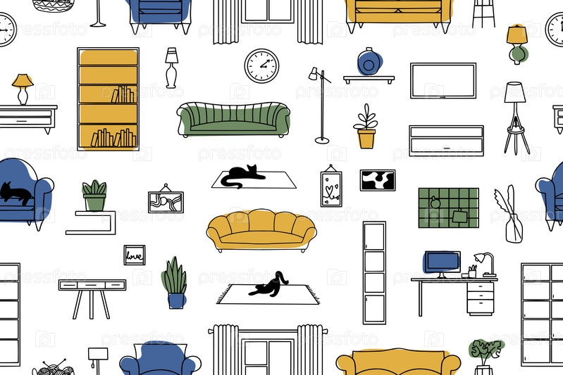 Бесшовный рисунок мебели, светильников, предметов интерьера. Современная векторная иллюстрация для баннера, веб-страницы, печатных СМИ. Вектор
