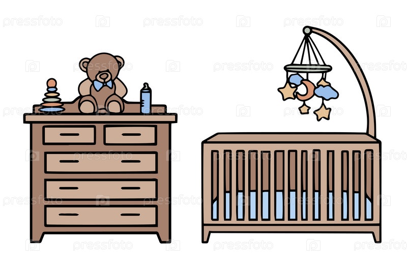 Мебель для детской комнаты. Детская кроватка, игрушки и комод с игрушками. Иллюстрация каракулей. Вектор