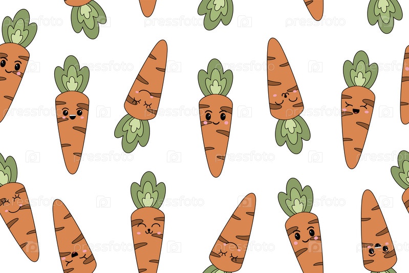 Векторный бесшовный рисунок моркови, нарисованной вручную, с лицом Каваи, изолированным на белом фоне. Векторная иллюстрация