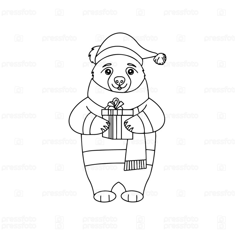 Векторная новогодняя открытка. Милый мишка в новогоднем свитере с подарком в лапках. Рождественская открытка