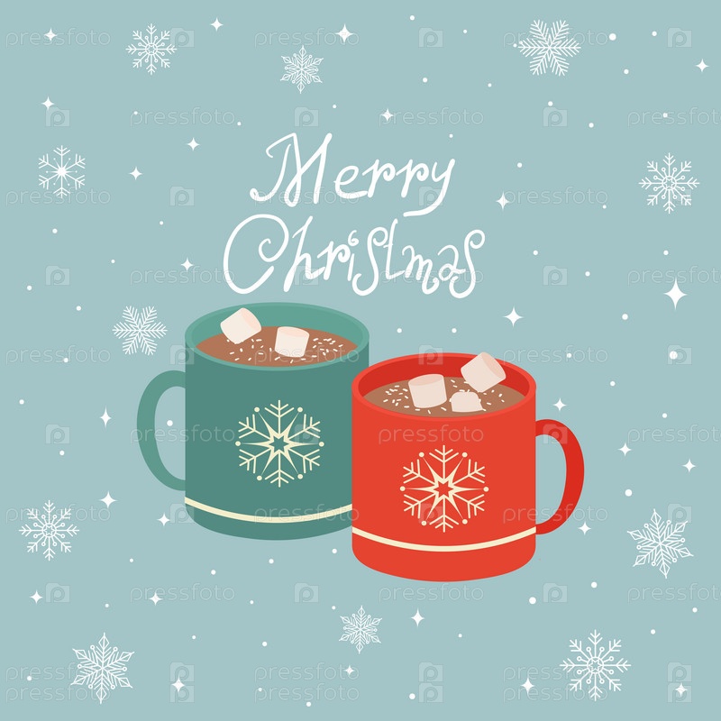 Рождественские кружки с горячим какао или кофе, сливками. Можно использовать для поздравительных открыток, приглашений на вечеринки, плакатов или наклеек. Векторная иллюстрация