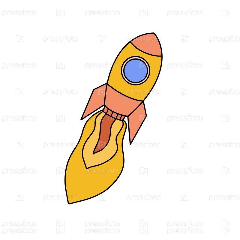 Контур ракетного корабля с огнем. Изолированные на белом. Значок плоской линии. Векторная иллюстрация с летающей ракетой. Космическое путешествие. Знак запуска проекта. Символ творческой идеи. Черное и белое