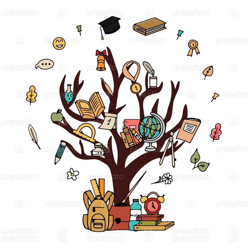 Дерево знаний, концепция школы для вашего дизайна. Школьные принадлежности в стиле каракулей. Векторная иллюстрация