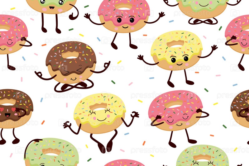 Бесшовный узор с милыми милыми забавными пончиками в стиле каваи. Векторная иллюстрация
