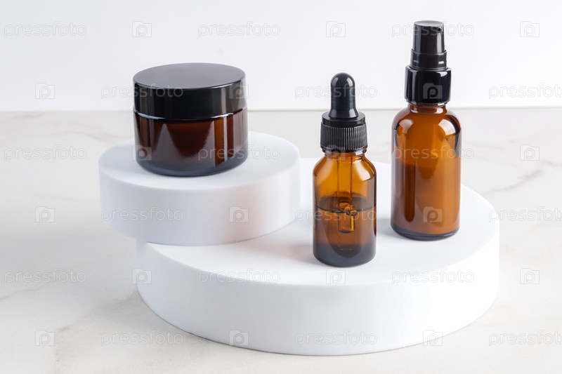 Набор косметических товаров в стеклянных бутылках на белых подиумах на мраморном фоне. Набор для ежедневного ухода за кожей. Мокап для дизайнеров
