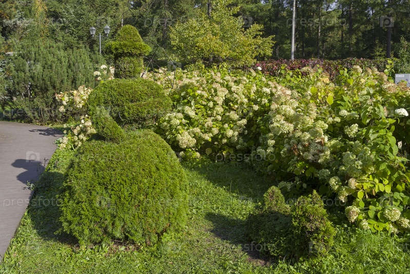 Оригинальная садовая скульптура - резултат фигурной обрезки деревьев. Композиция "Дама с собачкой". Большой розарий в парке Сокольники, Москва, Россия. Солнечный день во второй половине сентября