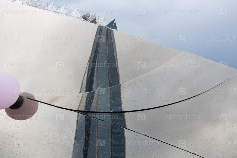 Башня Газпром, Лахта Центр отражается в уличном декоре с каплями дождя - Санкт-Петербург, Россия, Август 2023