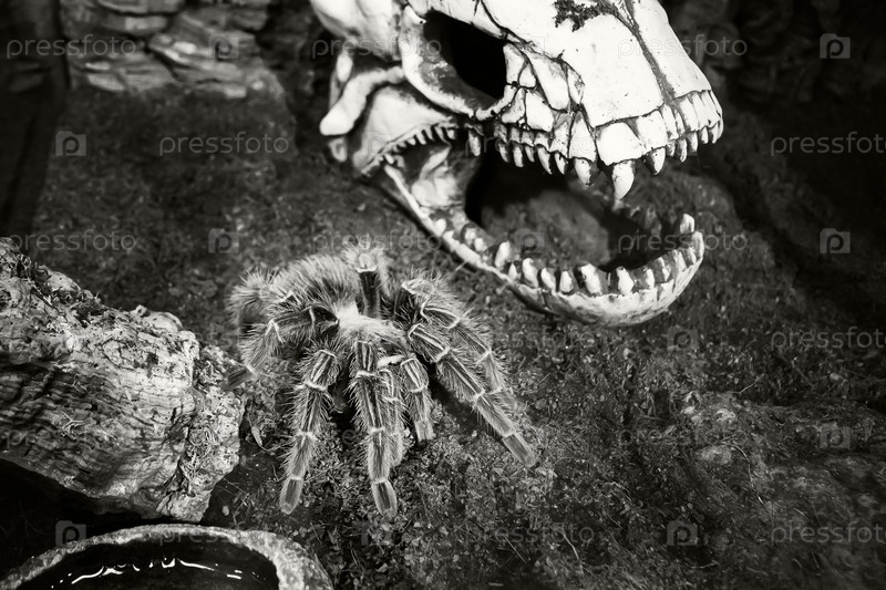 Паук-птицеед в террариуме с декоративным черепом, черно-белое фото
