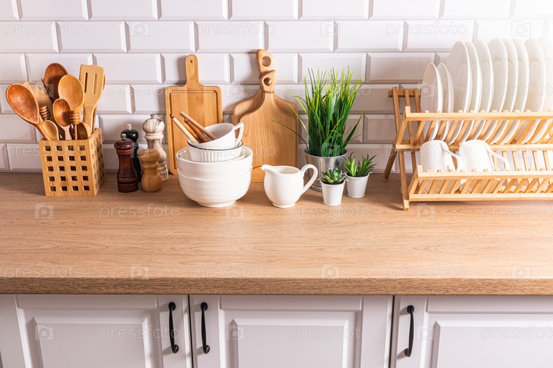Красивый кухонный фон с различными предметами и кухонной утварью из экологически чистых материалов. деревянная столешница, стена из белого кирпича