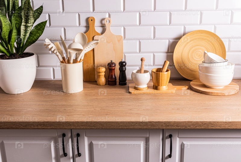 Набор различных кухонных инструментов, посуда из экологически чистых материалов на кухонной столешнице, стена из белого кирпича. Эко-интерьер