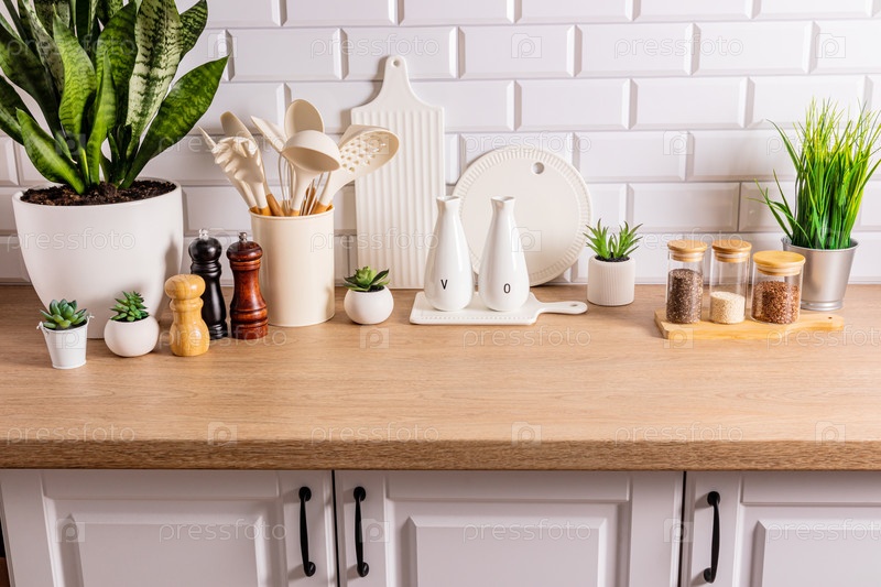 Белая керамическая посуда и кухонная утварь на деревянной столешнице на экологически чистой кухне с зелеными комнатными растениями. Уютный дом
