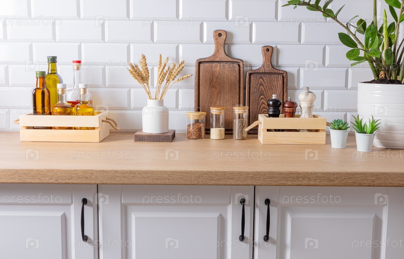 Зона хранения специй и масла в различных емкостях и экологически чистых деревянных ящиках на кухонной столешнице. передний план