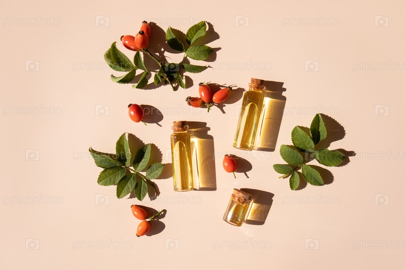 Три флакона с пробкой с натуральным косметическим маслом семян шиповника среди ягод и листьев растения. Вид сверху. Плоская планировка