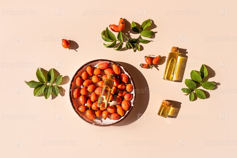 Несколько стеклянных бутылок с пробковой крышкой с органическим маслом шиповника и миска со свежими ягодами. Вид сверху. Плоская планировка. естественный уход