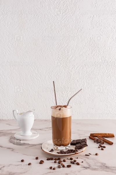 Высокий стакан с шоколадным напитком с корицей и кусочками шоколада стоит на тарелке и мраморном столе. кофе латте, моча. Вкусный напиток