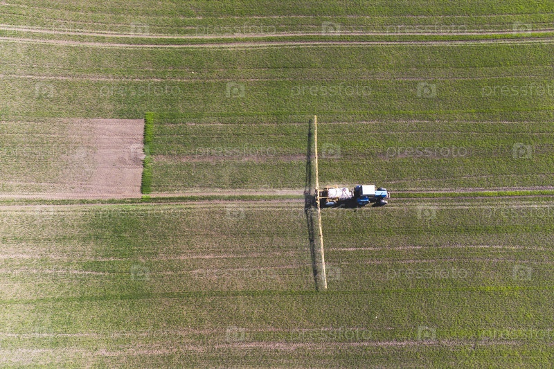 Вид с воздуха на вспашку и опрыскивание сельскохозяйственным трактором поля. Сельское хозяйство. Вид сверху. Фотография сделана с помощью дрона