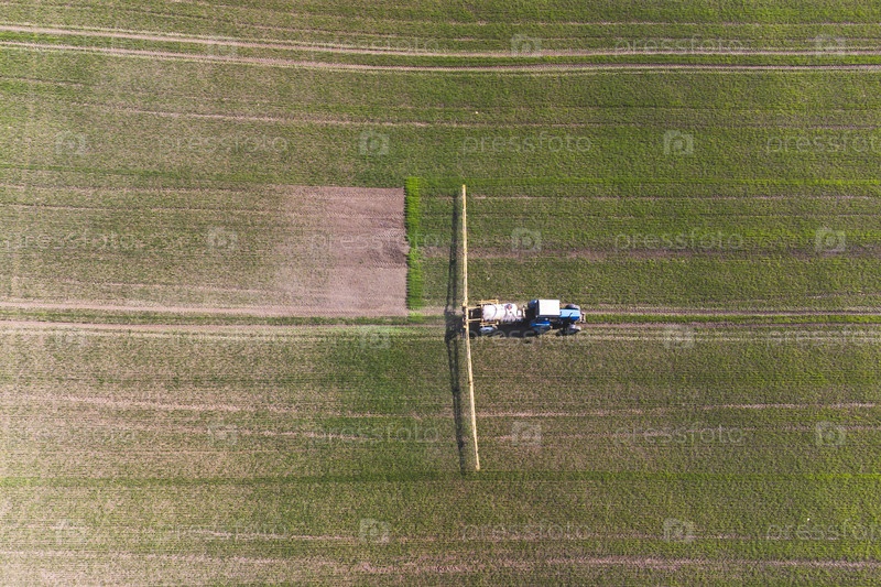 Вид с воздуха на вспашку и опрыскивание сельскохозяйственным трактором поля. Сельское хозяйство. Вид сверху. Фотография сделана с помощью дрона