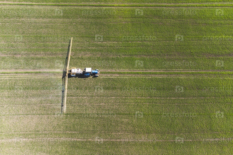 Вид с воздуха на вспашку и опрыскивание сельскохозяйственным трактором поля. Сельское хозяйство. Вид сверху. Фотография сделана с помощью дрона