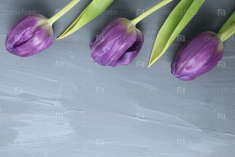Цветочный фон тюльпанов. Фиолетовые тюльпаны на сером фоне с местом для текста макета. Шаблон весеннего цветения для объявлений поздравительных открыток