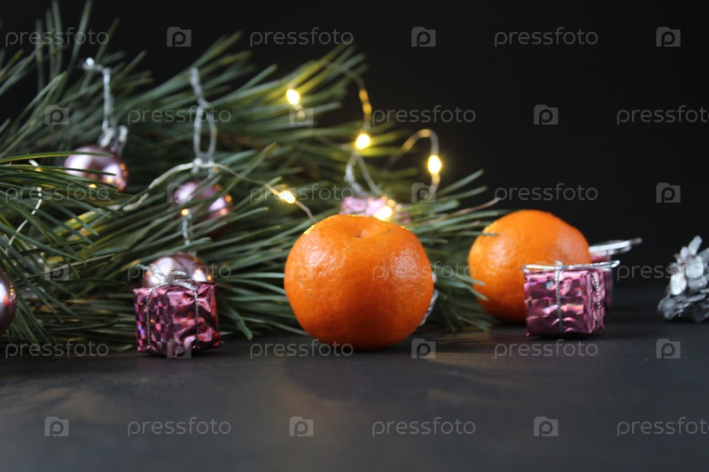 Новогодний рождественский натюрморт: ветка сосны рядом с мандариновыми шишками, серебряная горящая гирлянда на черном фоне с местом для текста с копировальным пространством. Праздничный фон
