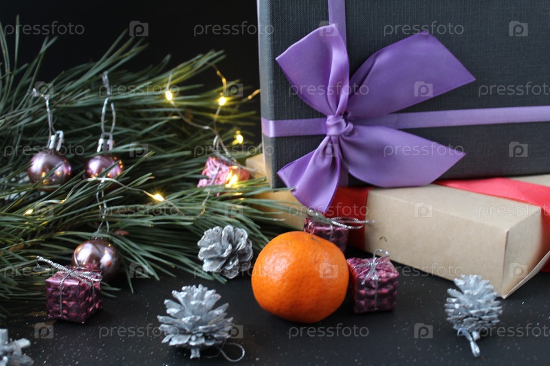 Новогодний рождественский фон. Подарочные коробки в упаковке с бантиками и лентами лежат рядом с еловой сосной, горящей праздничной гирляндой, рядом с серебряными шишками мандарина на черном фоне. Сочельник праздничная атмосфера Сочельник