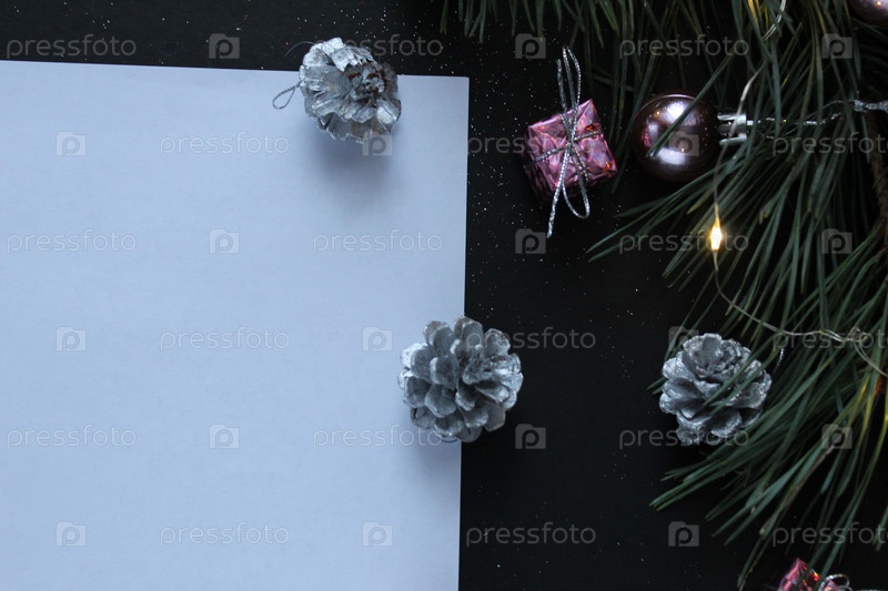 Белый лист бумаги рядом с веткой сосны рядом с конусом гирлянды с местом для текста и копировальным пространством