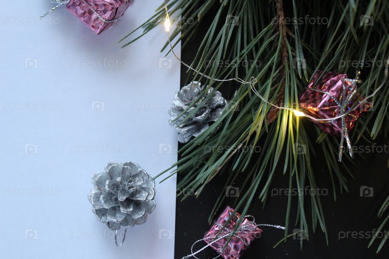 Белый лист бумаги рядом с веткой сосны рядом с конусом гирлянды с местом для текста и копировальным пространством