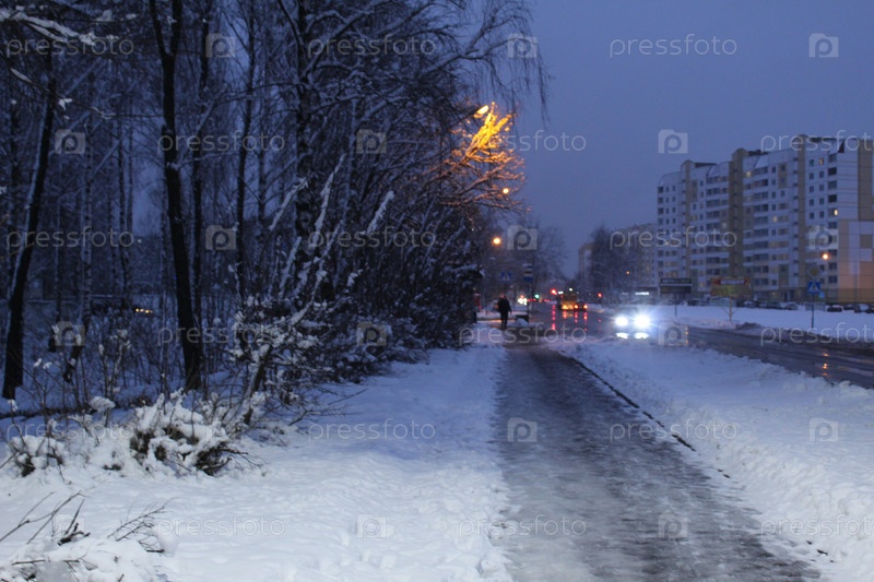 Ночной пейзаж в зимнем городе вечером в снегу возле аллеи деревьев огни домов и фонари