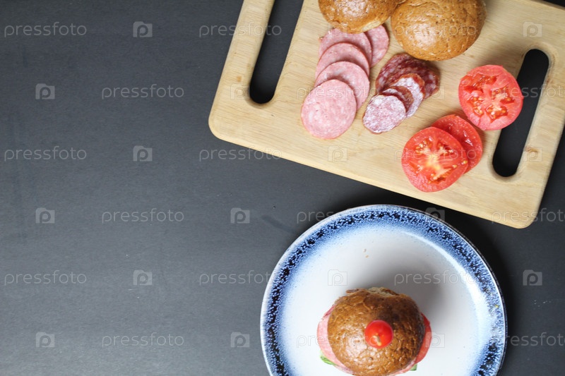 Приготовление сэндвича, овощи и рожь, булочка с колбасой лежат на подносе из дерева на черном фоне. вид сверху. завтрак обед перекус