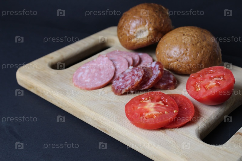 Подготовка к приготовлению. Ингредиенты для сэндвича с салатом. Овощи, помидоры, хлеб, булочка, гречка, колбаса, ветчина лежат на подносе на черном фоне с копировальным пространством для текста
