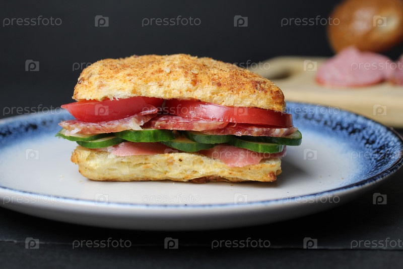 Сэндвич-сэндвич из белой квадратной булочки с овощами, помидорами, огурцами, колбасой, ветчиной на синей тарелке. на заднем плане — поднос с ингредиентами, колбасой, овощами, помидорами на черном фоне. Обед вкусный, домашний перекус