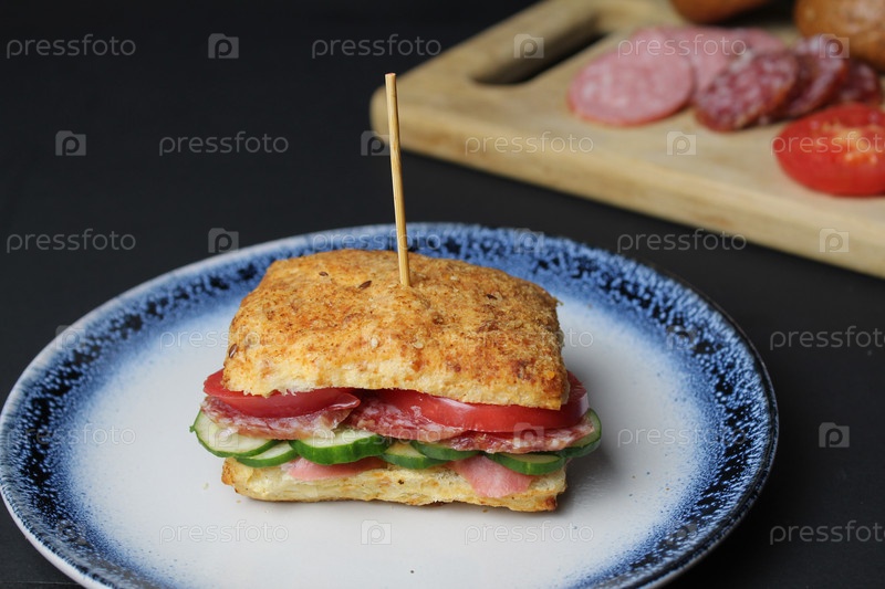 Сэндвич-сэндвич из белой квадратной булочки с овощами, помидорами, огурцами, колбасой, ветчиной на синей тарелке. на заднем плане — поднос с ингредиентами, колбасой, овощами, помидорами на черном фоне. Обед вкусный, домашний перекус