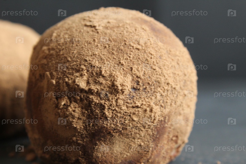 Круглый шоколадный торт в какао крупным планом на фоне черного камня. Еда домашний десерт