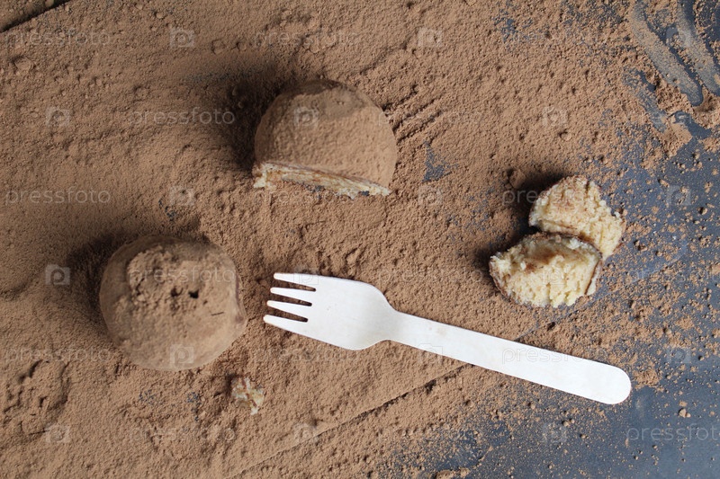 Круглый шоколадный кофейный торт на черной грифельной доске на какао с деревянной вилкой. День десертного шоколада