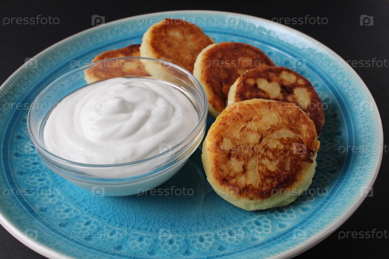 Завтрак, сырники, сырники, несколько штук пять лежат на большой синей тарелке со сметаной и белым соусом. Традиционное блюдо русского славянского завтрака на черном фоне
