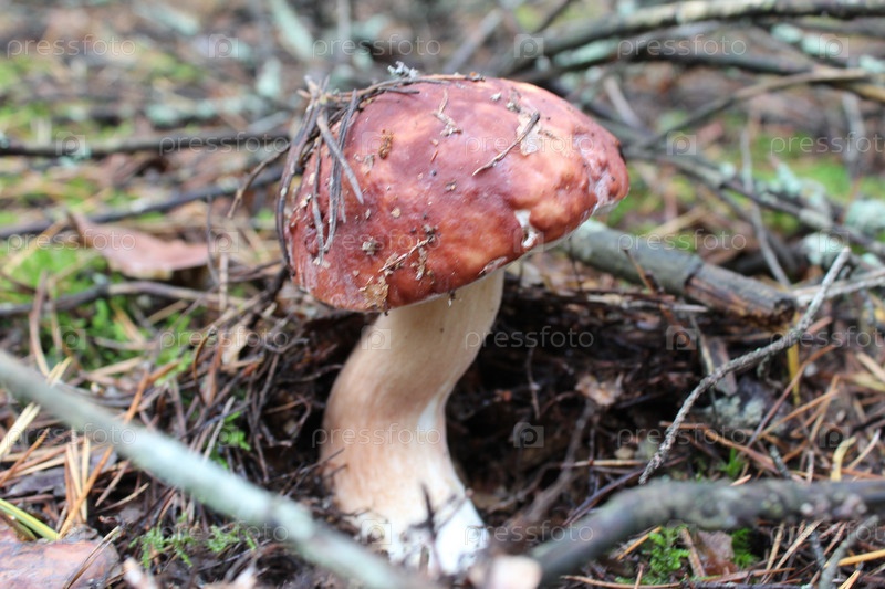 Белый борщевик растет в лесу под мхом. Гриб с белой ножкой и коричневой шляпкой. Съедобные грибы