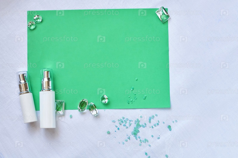 Косметический макет белых бутылок. Плоское пространство для копирования, вид сверху. Брендинг продукции, косметический фон. Концепция натуральной косметики по уходу за кожей на белом фоне в зеленой рамке
