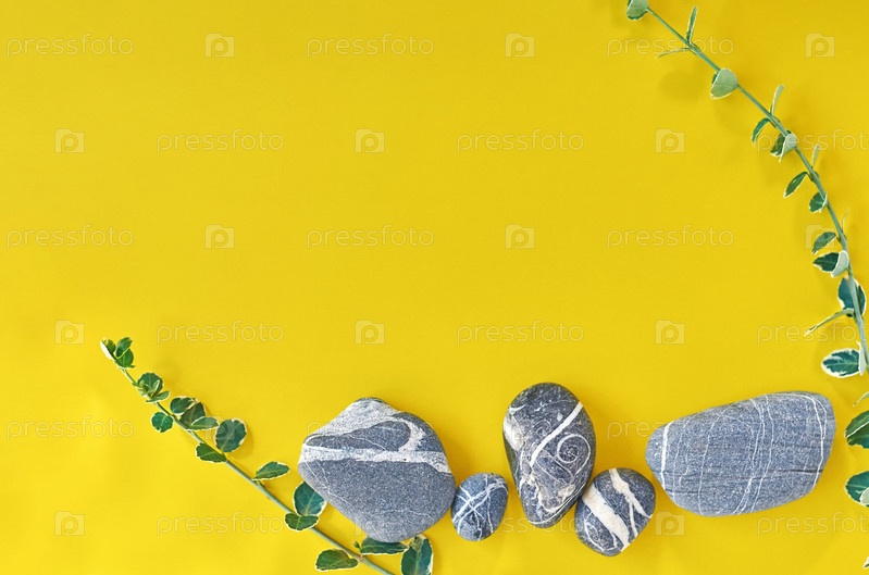 Морские камни, галька. Косметический макет синей бутылки. Плоское пространство для копирования, вид сверху. Брендинг продукции, косметический фон. Концепция натуральной косметики по уходу за кожей на желтом фоне