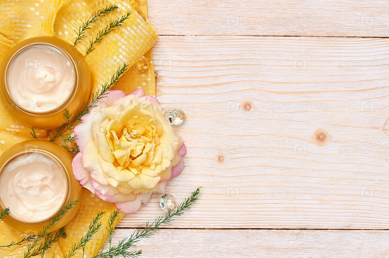 Круглые баночки с косметическим кремом. Косметические макеты бутылочек. Плоское пространство для копирования, вид сверху. Концепция натуральной косметики по уходу за кожей. на деревянном фоне и желтой салфетке