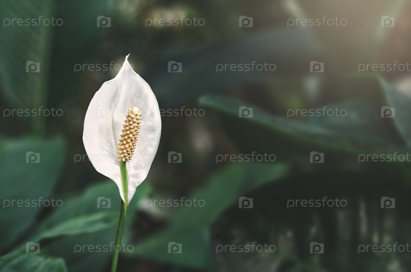 Белый цветок спатифиллума растет в зеленом саду